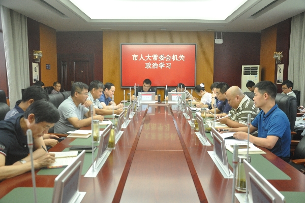 7月19日上午, 市人大常委會黨組成員、辦公室主任齊紹進主持人大機關開展政治學習,市人大常委會主任王育平,副主任鄧惠榮、黃費武、李亞林、鄧開泉及全體機關干部職工參加。